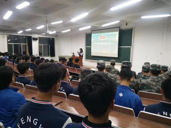 誓师大会上首先播放了2019年社会实践宣传视频,视频中老队员快乐工作,快乐生活的实践镜头及在实践岗位上表现出的良好素质,深深的激励着在场的每一个同学。通过社会实践同学们真正感受到学院的担当和付出,实践使同学理解了学院的良苦用心,通过实践锻炼了自我,强大了内心。