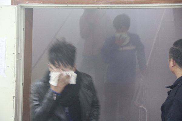 下午3点05分,工作人员点燃事先准备好的模拟烟雾弹,3号、4号、5号楼里瞬间浓烟弥漫。紧接着警报声在楼道和各教室响起,各楼层负责老师迅速应对,第一时间引导学生有序撤离“火场”,并不时提醒同学要低头弯腰,用湿毛巾捂住口鼻,躲避浓烟;同学们按照指引,迅速地沿安全通道撤离“火灾现场”,及时疏散到安全区域。演练从警报拉响开始,到3000多人分别从4栋公寓楼全部撤出,共用时2分36秒,达到了演练要求。