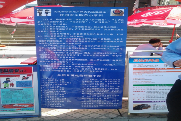 活动由大连市法制协会、大连市文明办、大连市警察协会联合主办,启动仪式在胜利露天广场举行,参加活动的我院100名师生,队伍整齐,服装统一,坐姿端正,烈日下暴晒2个多小时,仍然保持着高昂的精神状态,他们不时观看和了解校园安全防范小常识,不时听民警讲解预防监控洗钱活动,活动现场的法律常识有奖问答,我院师生更是举手积极,发言踊跃,活动结束后,我院同学主动帮忙清理广场的垃圾,受到了举办方的高度赞扬。