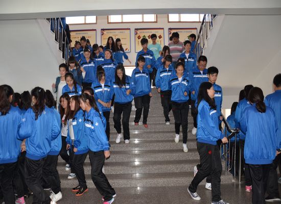 第二次警报声响,所有工作人员、辅导员老师指挥学生迅速有序地跑出教室,按着预定路线向操场疏散。同学们按着老师的指挥井然有序地弯腰、抱头,贴着墙角按指定路线快速往楼下跑去,来到宽阔的足球场集合,并按班级快速站好。随后辅导员快速清点人数,及时上报给现场指挥,整个演练过程只用了2分30秒。
